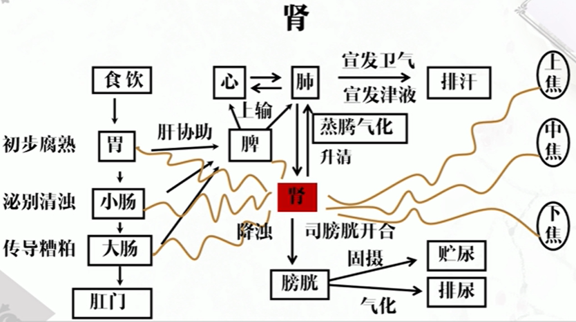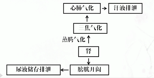肾大肠膀胱在水液代谢中的作用,主要表现为下焦气化。