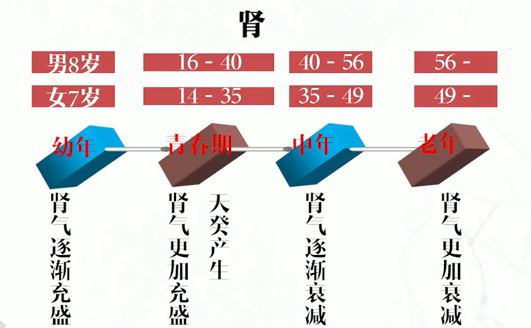 | 男子 | 肾气实 | 肾气盛 | 天癸至 | 肾气平均,真牙生而长极 | 身体盛壮 | 肾气衰 | 阳气衰 | 肝气衰 |
